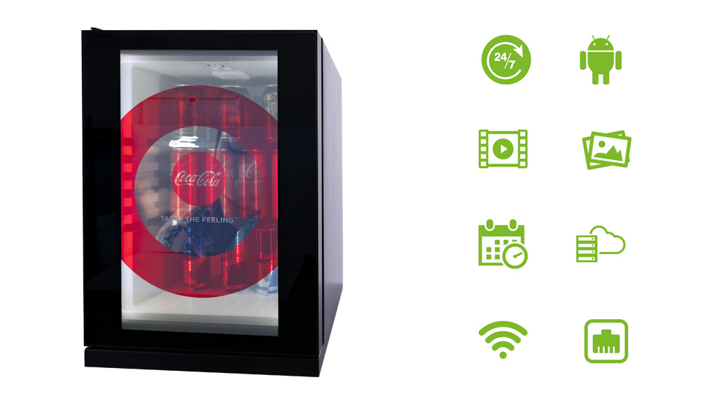 Lednička obsahuje inteligentní systém přehrávání video obsahu na jejích dveřích, což je zároveň transparentní LCD displej. Dále má zabudované výkonné osvětlení s vnitřním LED systém pro nasvícení produktů uvnitř ledničky. Transparentní displej tak zobrazuje kvalitní barevný obraz, který nezamezuje náhled na produkty uvnitř ledničky a dveřní displej přehrává obsah, i když jsou dveře otevřené. Jakmile klient dostane toto unikátní řešení do rukou, řeší jen jakým kreativním způsobem bude přímo na displeji dveří ledničky komunikovat marketingový příběh produktu, který je uvnitř. Lednička je řízena přes inteligentní software, který ovládá nejen obsah na displeji, ale také LED podsvícení dveří a celé ledničky. Zákazník tedy efektivně a úsporně řídí časový průběh přehrávání videoobsahu a LED podsvícení ledničky, což ušetří také na provozu v době, kdy je prodejní místo zavřené pro zákazníky. Chladící okruh ledničky nadále nepřetržitě pracuje a produkty v ní zůstávají vychlazené.