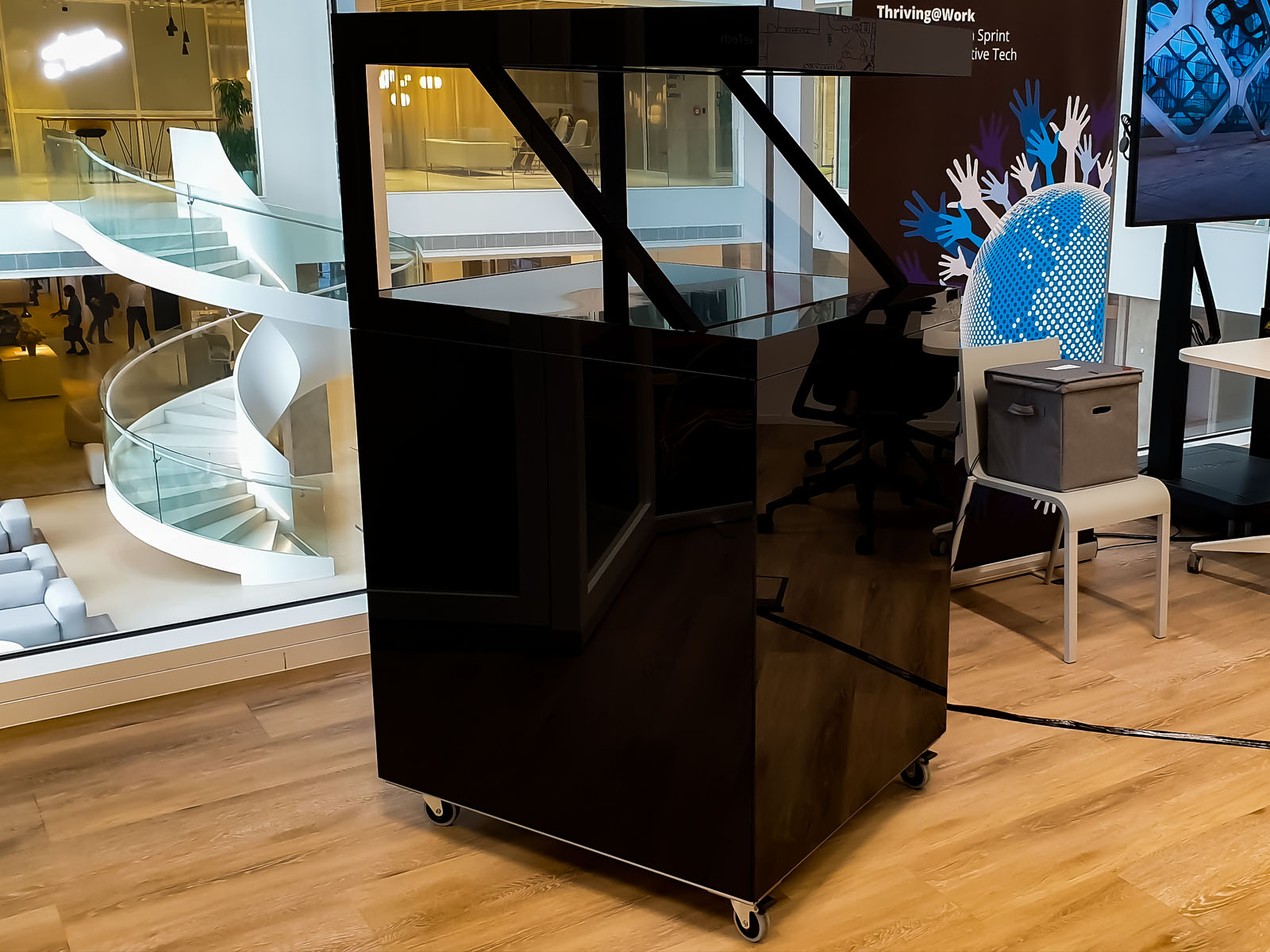 32″ 3D Holobox with 1000 cd high brightness display. Lightweight ALU profile construction, gloss black plexi cladding.